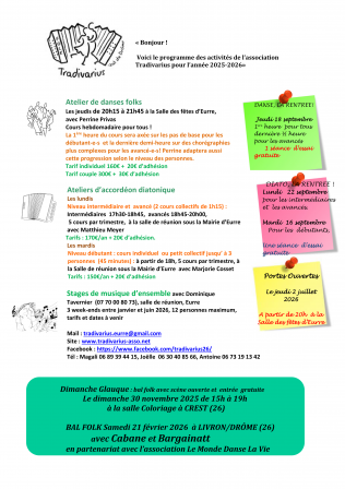 Tradivarius et "le Monde danse la Vie" organisent le samedi 1er mars 2025 à Livron-sur-Drôme (26), salle Simone Signoret à côté de la Mairie (90 Av. Joseph Combier, 26250 Livron-sur-Drôme )
